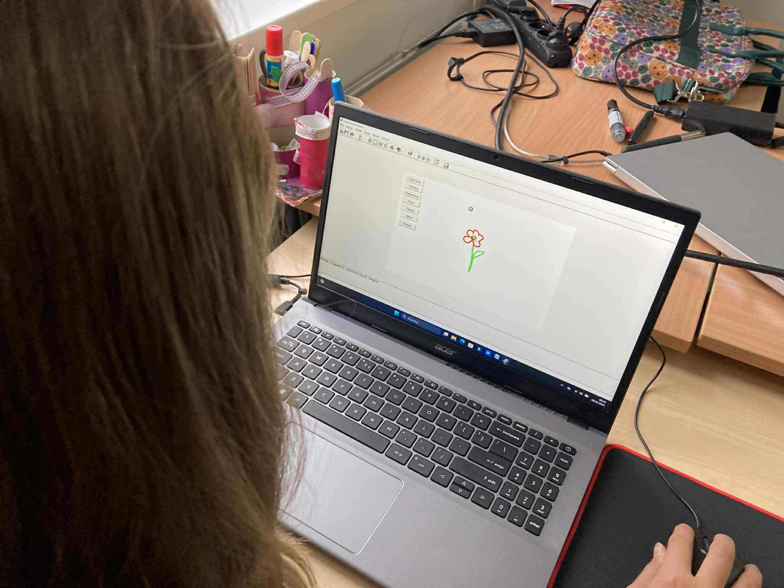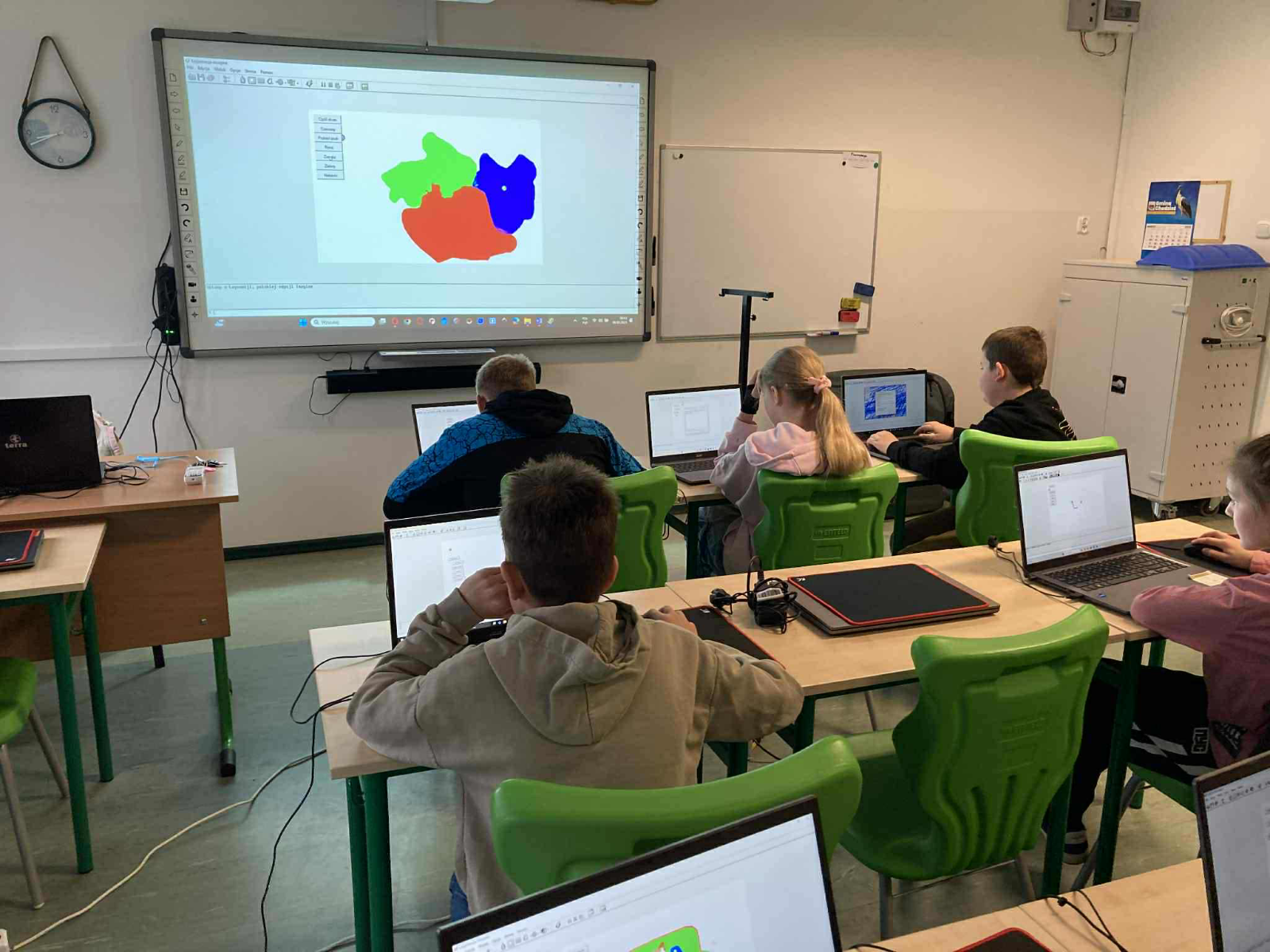Podczas zajęć uczniowie połączyli programowanie i sztukę, tworząc w środowisku Logomocja własne, interaktywne narzędzie do malowania – miniaturowy „Paint”. Poznali sposób działania żółwia rysującego, programowali zmiany koloru, grubości pisaka oraz narzędzie do ścierania.