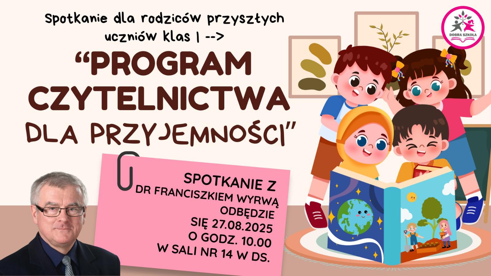 Serdecznie zapraszamy Państwa na spotkanie z Panem dr inż. Franciszkiem Wyrwa, podczas którego zostanie przedstawiony Szkolny Program Czytelnictwa dla Przyjemności.