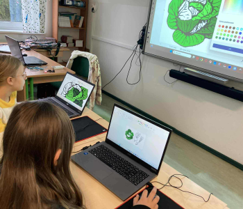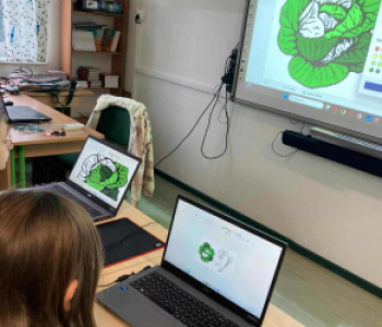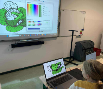 Podczas wspólnych zajęć z informatyki i plastyki uczniowie poznawali zasady mieszania barw podstawowych i tworzenia kolorów pochodnych, wykorzystując program Paint. Nauczyciel wprowadził pojęcie barw RGB i pokazał, jak komputer tworzy kolory z trzech składowych: czerwonej, zielonej i niebieskiej.