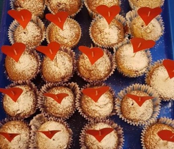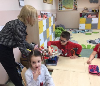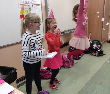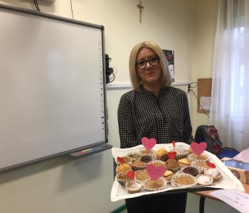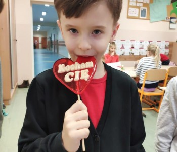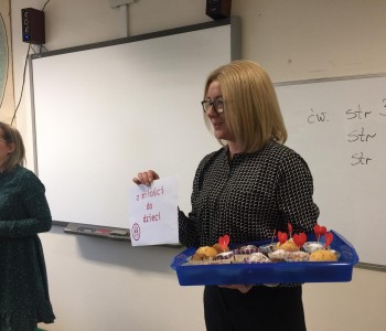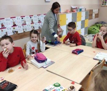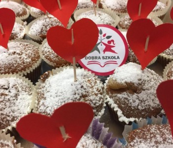 Rodzice upiekli walentynkowe babeczki i ciasteczka, które zapełniły szkolny bazarek. Zrobiło się nam jeszcze cieplej, gdy z gorącymi życzeniami Pani Dyrektor Dorota Kolasa rozniosła walentynkowe babeczki wszystkim uczniom, a Prezes Stowarzyszenia Dobra Szkoła, Pani Aleksandra Szajowska częstowała serduszkowym lizakiem.