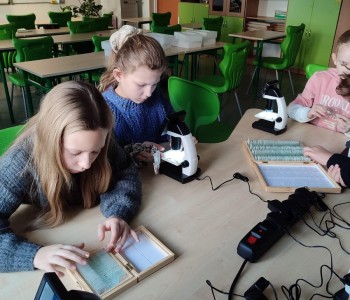 Na początku zajęć uczniowie poznali zasady pracy z mikroskopem cyfrowym. Następnie mogli obserwować gotowe preparaty trwałe, przedstawiające różne zjawiska i obiekty przyrodnicze.